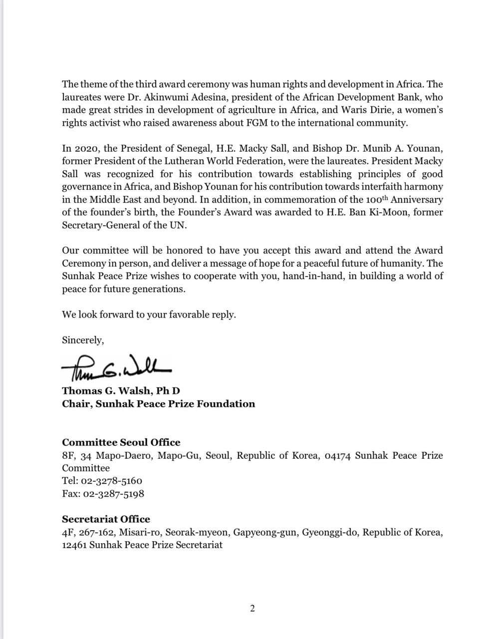 According to a letter from Dr. Thomas G. Walsh, President of the Sunhak Peace Foundation, released on January 25, 2022, the award ceremony will be held on February 12, 2022 in Seoul, South Korea and this award is due to the consistent leadership of the past many years as the Prime Minister of the Kingdom of Cambodia, and the leadership of Samdech Hun Sen really contributed to peace building, economic development and Peace in Cambodia and in the whole of Southeast Asia.